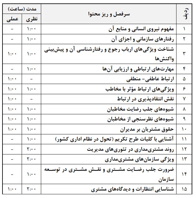 - شیوه هاي جلب رضایت و نظرسنجی از مراجعان را بداننـد و در یـک موقعیـت فرضـی شـیوه هـاي جلـب رضایت و نظرسنجی از مخاطب را به طور عملی انجام دهند.